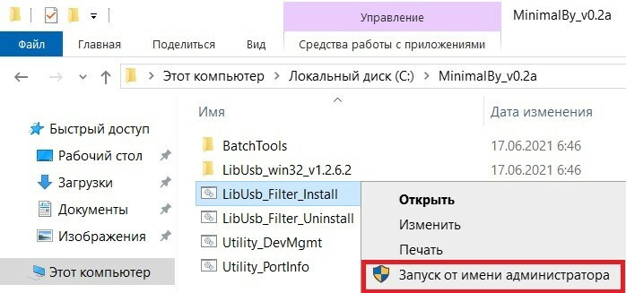 2. Подключаем ноутбук проводом USBMale-Maleк USBв автомобиле, открываем папку MinimalBy_v0.2aи находим в ней файл LibUsb_Filter_Install. Нажимаем на него правой кнопкой мыши, наводимся на надпись "Запустить от имени администратора", но не нажимаем пока что.