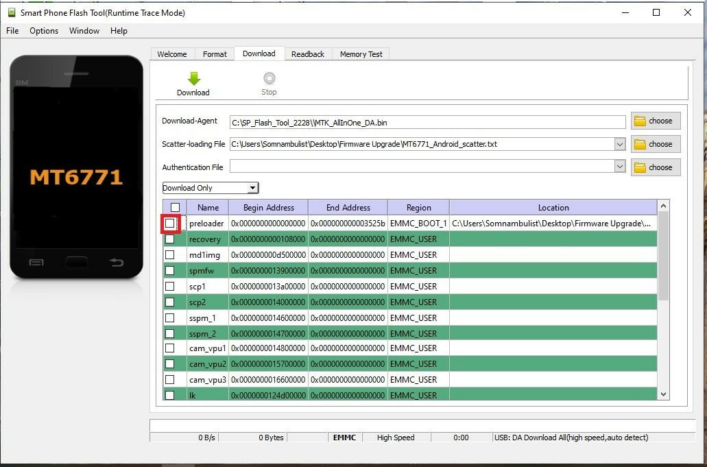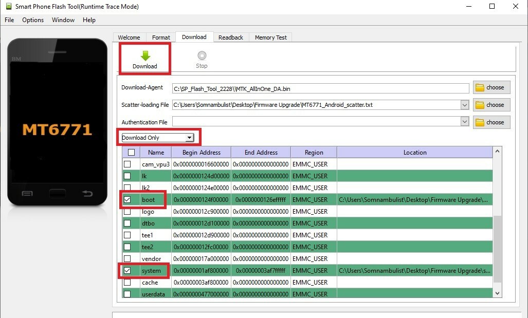 ВАЖНО! Сразу же уберите галку напротив файла preloader, а также проверьте, что стоят галки на необходимых нам разделах boot.img, lk.bin и system.img, а также убедитесь, что режим выбран Download Only, и только после этого продолжайте!