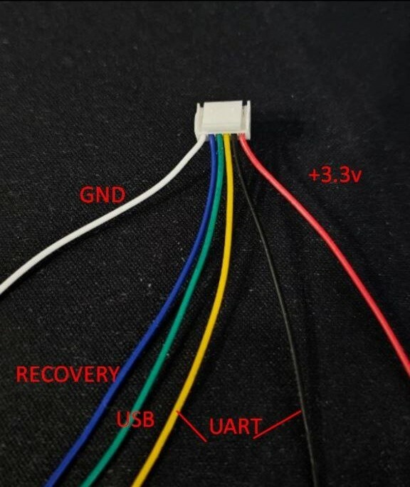 Разъем предварительно нужно подготовить – соединить между собой белый и синий провода (GND и RECOVERY) и зелёный с красным (USB и 3.3В). Два оставшихся провода заизолировать во избежание контакта с чем-либо.