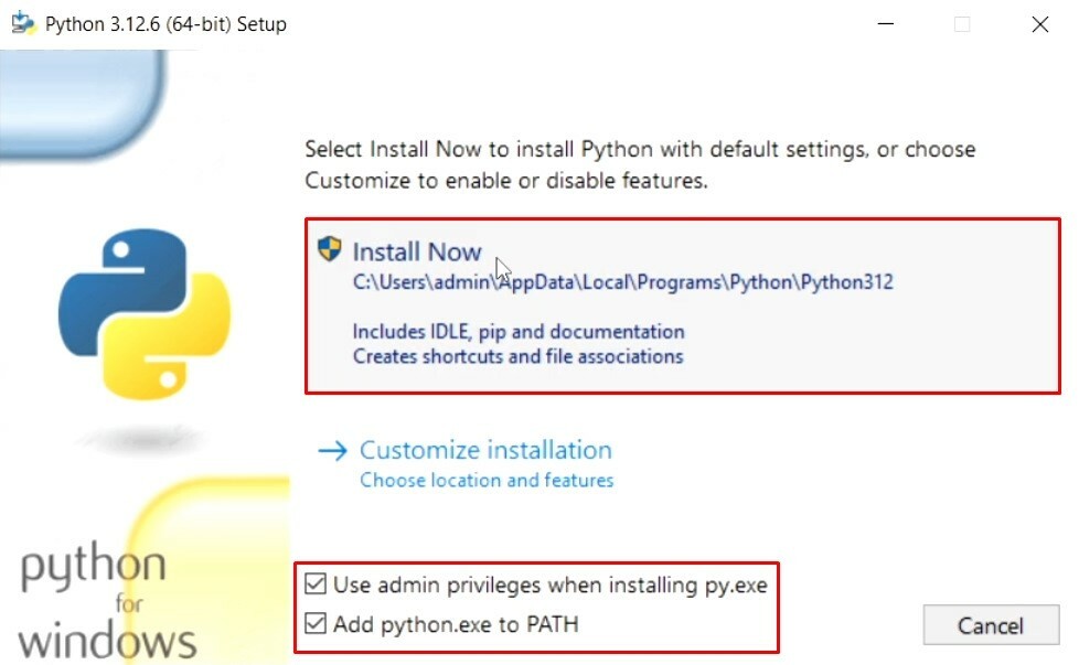 3. Установите Python, приустановке выберите Use admin privileges when installing py.exe и Add python.exe to PATH