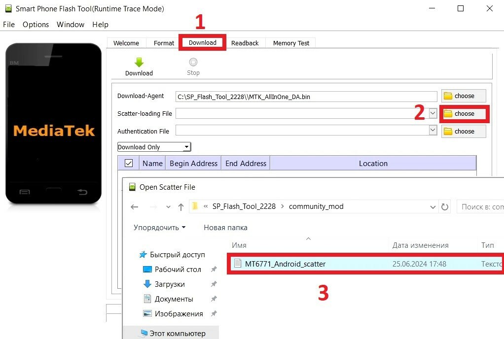 7. Запускаем программу SP Flashtool и открываем вкладку Download (1). В строке Scatter-loading File нажимаем на кнопку справа choose (2), выбираем папку с разархивированной прошивкой, выбираем файл MT6771_Android_scatter.txt (3).