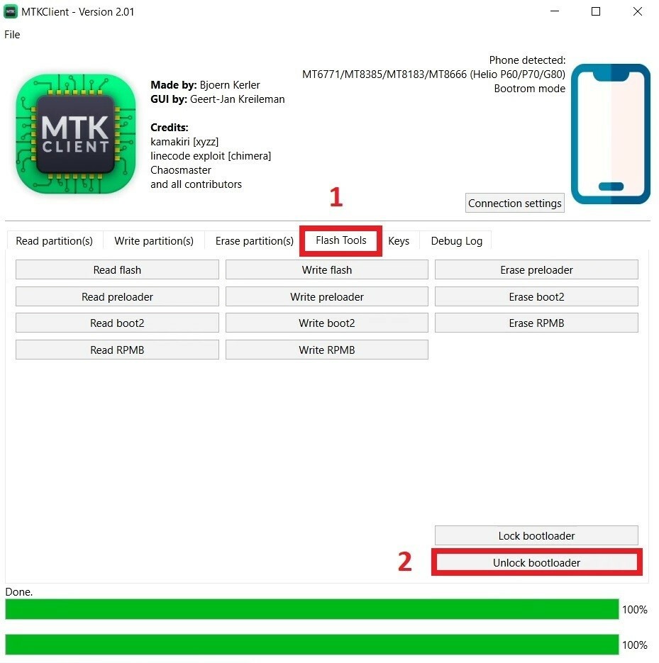 Далее нужно перейти на вкладку Flash Tools (1), затем нажать на кнопку Unlock bootloader (2) и дождаться выполнения процедуры на 100%. Закрываем окно программы, и обесточиваем блок ГУ.