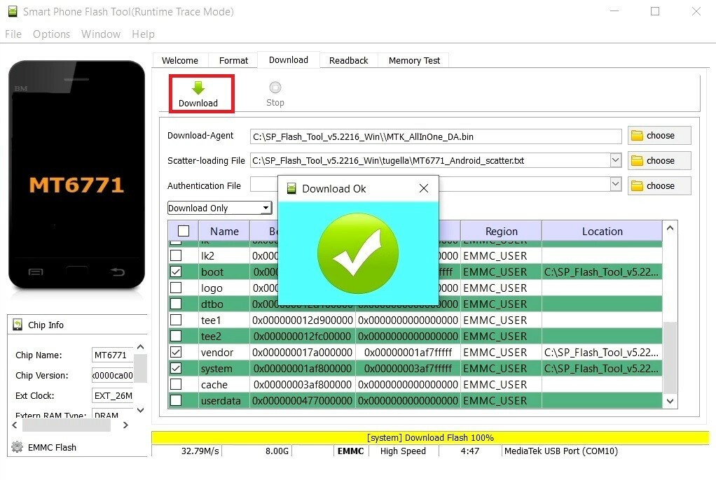 SP Flashtool автоматически определит список разделов, расположенных в одной папке с файлом MT6771_Android_scatter.txt, и добавит их для загрузки в ГУ.