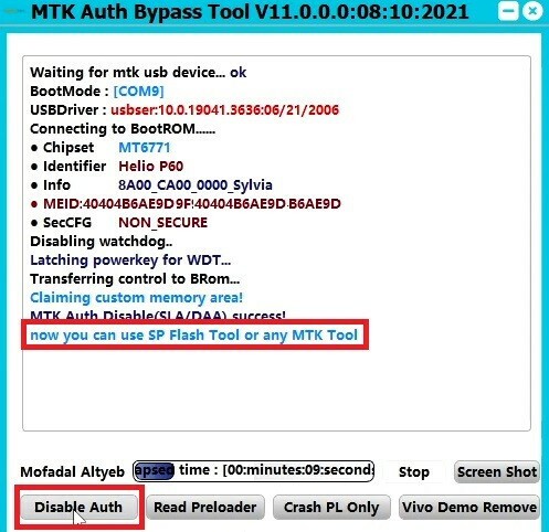 6. Запускаем MTK Auth Bypass Tool, жмем на кнопку Disable Auth и быстро подаем питание на ГУ, пока шкала не заполнилась до 100%.