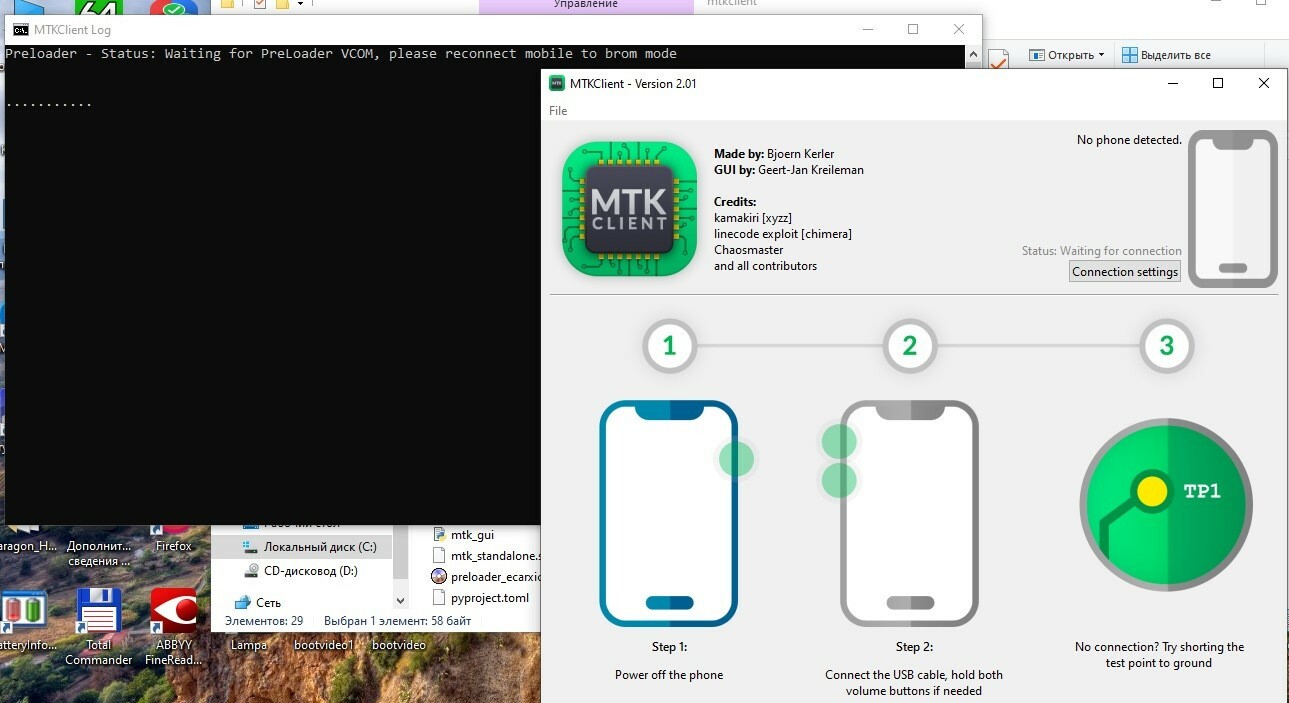 4. Обесточиваем блок ГУ. Запускаем на ноутбуке MTK Client (запускаем в папке с программой MTKClient_GUI 2.0.exe)